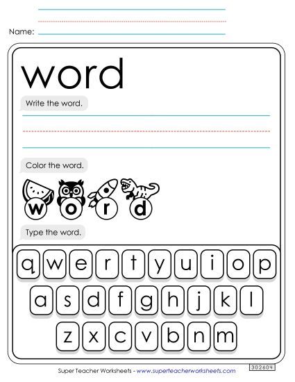 Write the word word. Then color the letters and picture symbols. Then practice typing it on the keyboard illustration.